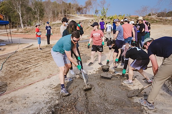在老挝的志愿服务期间,学生们的主要工作包括基础设施修建和英语教学工作。基础设施修建项目是为一所寺庙学校修建一条人行道。在雨季来临时,寺庙学校的泥路经常被雨水冲刷得泥泞不堪,修建好的人行道可以使当地的孩子们上学便利许多。我们的学生们在炎热的天气里铲沙石、铺水泥,修建道路。虽然这项工作很辛苦,对学生的体能是很大挑战,但是没有人抱怨,大家都很愿意为此奉献,觉得这一切是值得的。